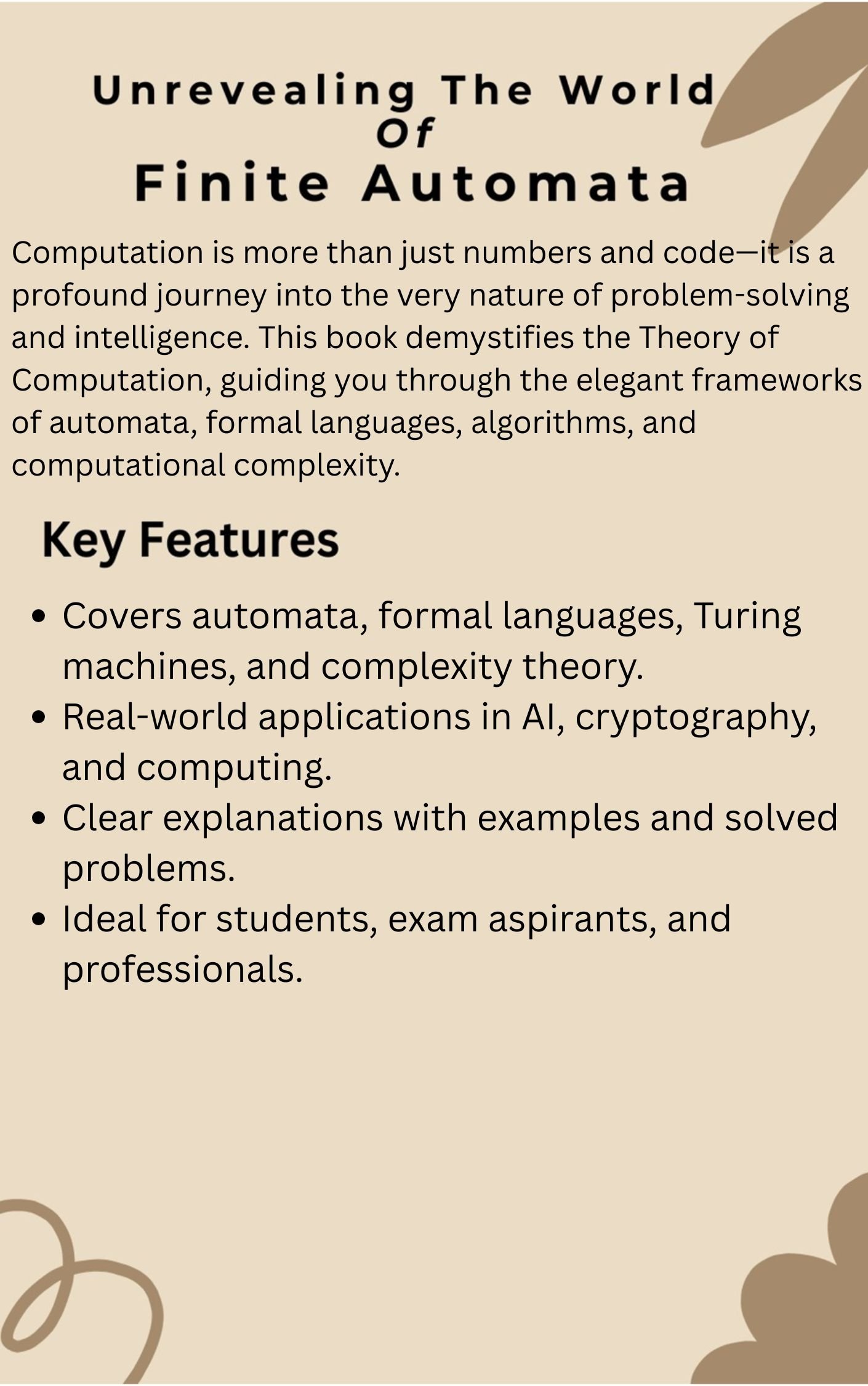 Unrevealing the World of Finite Automata is a concise yet comprehensive guide to the fundamental concepts of automata theory. This book unravels the mysteries of finite automata, formal languages, and computational models, making complex topics easy to understand. With clear explanations, real-world applications, and solved examples, it is perfect for students, competitive exam aspirants, and computing enthusiasts.